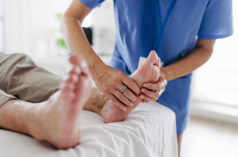 Close-up of a physiotherapist massaging a patient's knee during therapy.